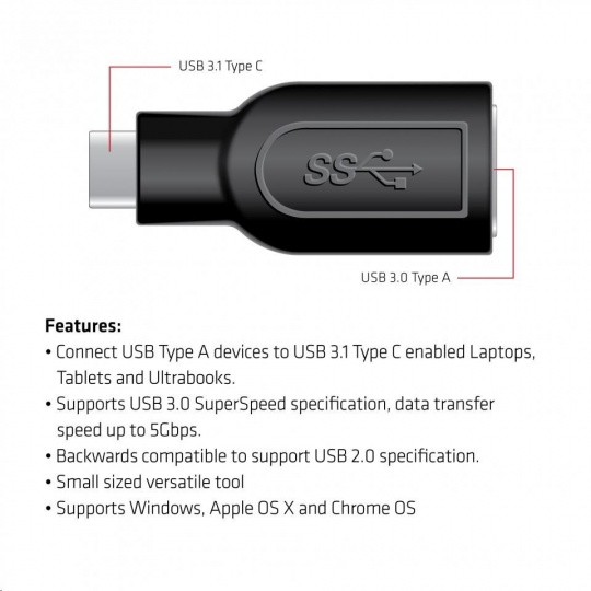 Adaptér Club 3D USB 3.1 type C to USB 3.0 umožňuje připojení vašich stávajících USB periferií, paměťových zařízení a dokovacích stanic s rozhraním USB typu A do notebooků, profesionálních tabletů a Ultrabooků s rozhraním USB 3.1 typu C. Adaptér je zpětně kompatibilní a podporuje také rozhraní USB 2.0. Specifikace USB 3.0 SuperSpeed zajišťuje přenos rychlosti 5 Gb/s pro rychlý přenos velkých souborů.