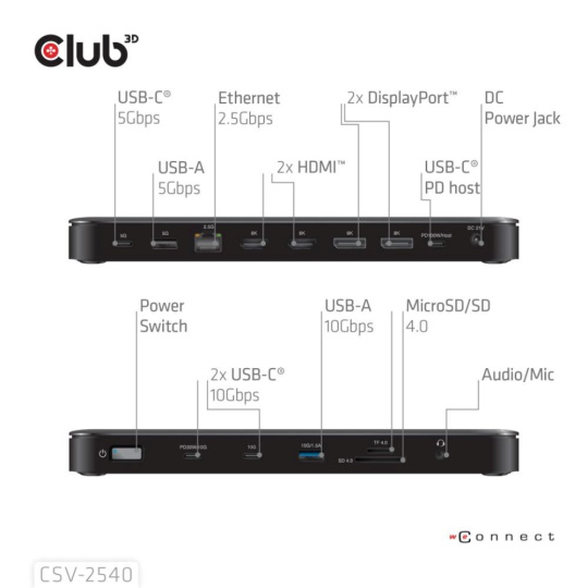 CSV-2540 je přenosná dokovací stanice 14 v 1 USB Type-C® 10Gb/s na čtyřnásobný displej s režimem 2 pruhů DisplayPort™ 2.1 Alt , která slouží k rozšíření portu Type-C® na více portů pro video, data, zvuk, Ethernet a napájení a představuje ideální řešení pro splnění požadavku uživatelů na rozšíření. Má 4 videa (výstup čtyř 4K/60Hz videí současně, pokud hostitel podporuje oba UHBR10&DSC) pro přenos videa, 5 portů USB pro přenos dat. 2,5 Gigabit Ethernet pro ultrarychlý Ethernet, čtečku karet microSD/SD, 3,5mm kombinovaný audio konektor. Kromě toho je tato dokovací stanice vybavena 150W stejnosměrným napájením, které nabízí max. 100 W pro připojený počítač a také max. 30W nabíjení pro mobilní zařízení USB-C.