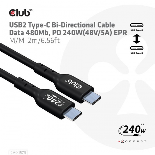 The Club 3D CAC-1573 USB2.0 Type-C Bi-Directional Cable, Data 480Mb, PD 240W(48V/5A) EPR, Extended Power Range M/M 2m/6.56ft connects your Notebook, Tablet or Phone with USB Type-C output to your favorite existing Peripherals, Accessories and Chargers. It enables Data and Power over a single cable and both ways. This cable supports USB2.0 data up to 480Mbps and up to 240Watt(48V/5A) output for Downstream charging or powering your Notebook, Tablet or Smartphone.