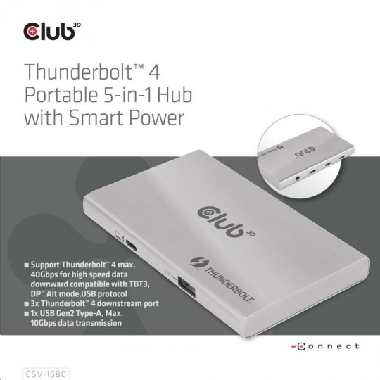 The Club 3D CSV-1580 is a Certified Thunderbolt™ 4 portable Hub which provides the most advanced, efficient, and versatile I/O solution available with up to 40Gb/s for data and video. For the first time this Thunderbolt™ 4 modern Hub has 3 Thunderbolt™ 4 downstream ports that allow you to cascade Thunderbolt™ 4 devices to one 8K30Hz or two 4K60Hz monitors, it can also easily connect to any USB Type-C device, all while simultaneously charging the PC. Besides, it supports Smart Power function which enables to distribute power according to the power consumption of the connected device, making full use of external power supply. It is designed for Thunderbolt™ 4 based PCs and Thunderbolt™ 3 based Macs™ utilizing MacOS™ 11 and later versions.