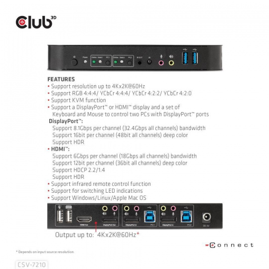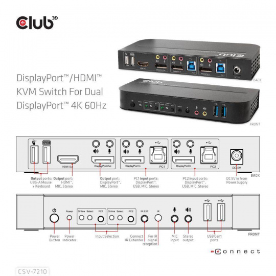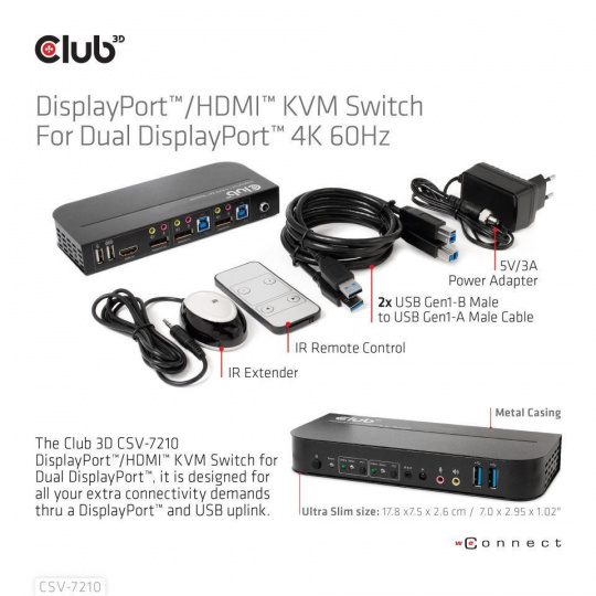 Club3D síťový přepínač - Switch, DP/HDMI KVM Switch - Dual DP 4K 60Hz