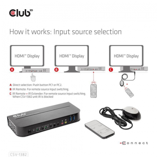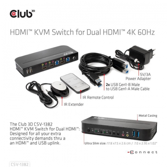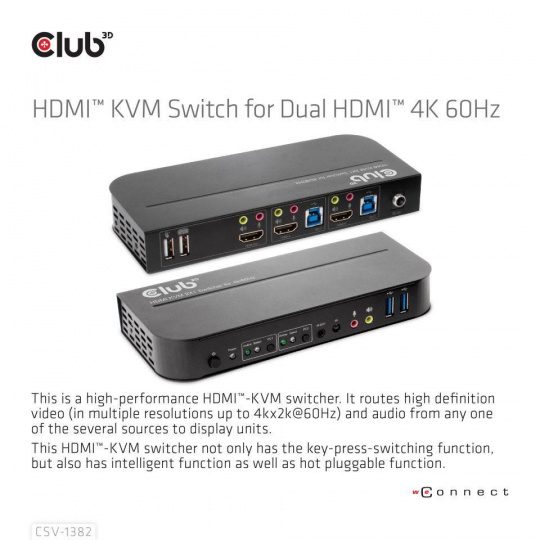 Club3D síťový přepínač - Switch, HDMI KVM Switch - Dual HDMI 4K 60Hz
