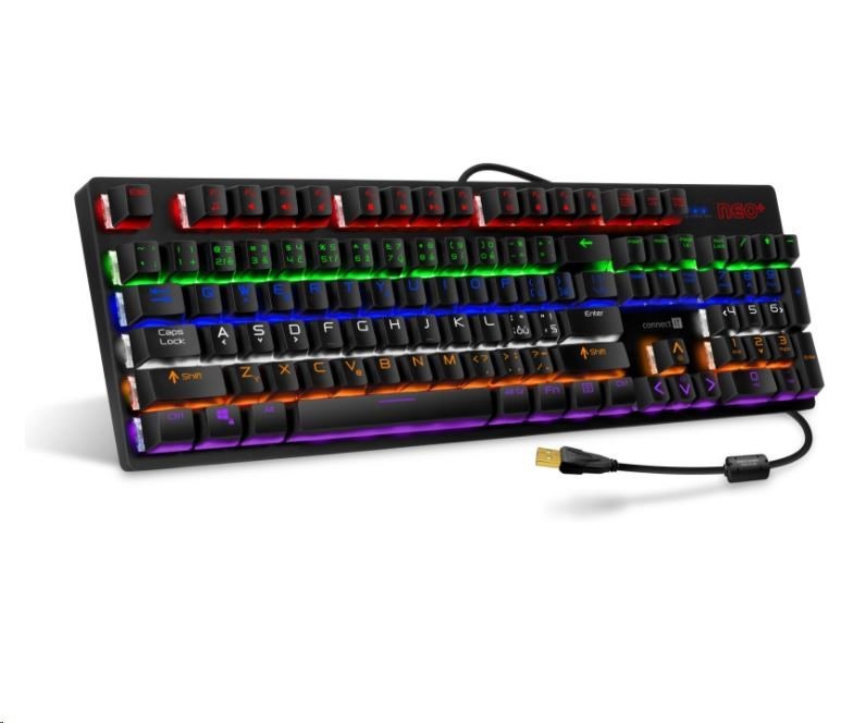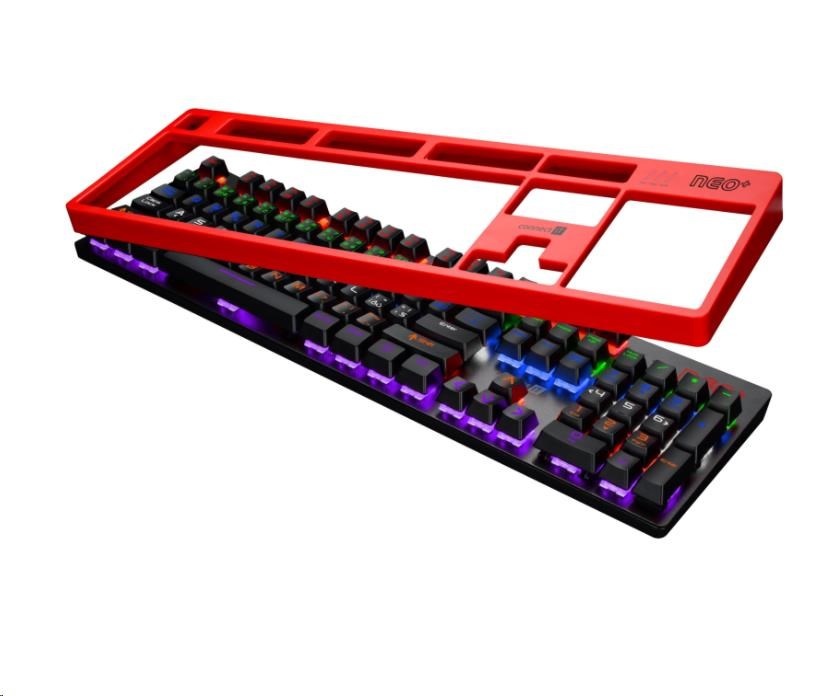 Profesionální mechanická klávesnice NEO+ series pro hráče počítačových her v českém a slovenském layoutu s celkem 22 módy barevného rainbow podsvícení a pětistupňovou regulací intenzity podsvícení. K dispozici je 12 multimediálních kláves.