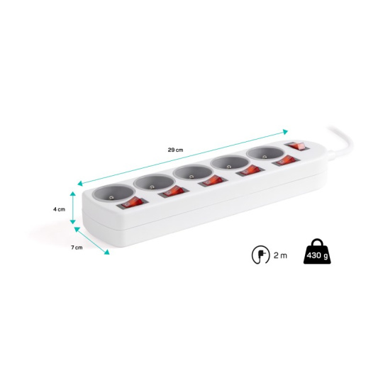 Prodlužovací kabelový přívod na 230 V je vybaven hlavním síťovým vypínačem, který při vypnutí zcela odpojí od přívodu elektrické energie všechny zapojené spotřebiče najednou. Prodlužovací kabel také disponuje s vypínači pro každou zásuvku zvlášť, sami si zvolíte, které zásuvky budou kdy zapnuty nebo vypnuty bez potřeby odpojování připojovacího kabelu od elektrospotřebiče. Extra výbavou je dětská ochrana všech zásuvek – zásuvky jsou přístupné pouze v případě zasunutí obou vidlic najednou, nelze tedy zasunout jednotlivě např. pouze šroubovák nebo pletací jehlici. Díky pootočení zásuvek o 45° je možné používat i objemnější napájecí adaptéry nebo úhlové koncovky.
