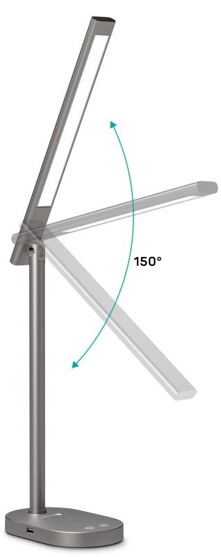 Díky sklopnému rameni nastavíte dokonalý úhel pro jakoukoliv práci. Lampička disponuje USB-A výstupem s výkonem 5 W a dvěma praktickými dotykovými spínači, které umožňují zapnout/vypnout lampu, nastavit 3 úrovně jasu světla nebo nastavit barevnou teplotu světla ve 3 různých úrovních (3000/4000/6500 K).