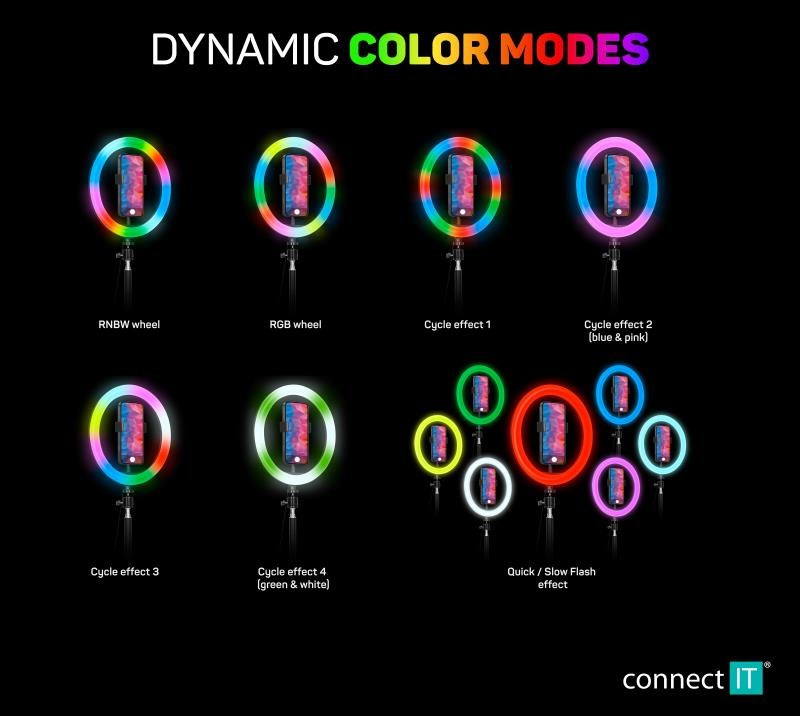 Kruhové selfie LED světlo "Selfie10RGB" s flexibilním držákem na mobilní telefon, stativem s kulovou hlavou a dálkovým ovládáním pro domácí i profesionální použití umožňuje nastavit 7 statických barev, 8 dynamických efektů a barevnou teplotu světla ve 3 různých úrovních (3200/4300/5500 K).