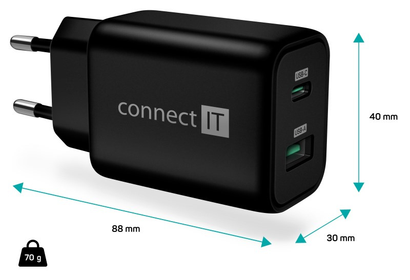 CONNECT IT Wanderer2 GaN nabíjecí adaptér 1×USB-C + 1xUSB-A, 33W PD, černá