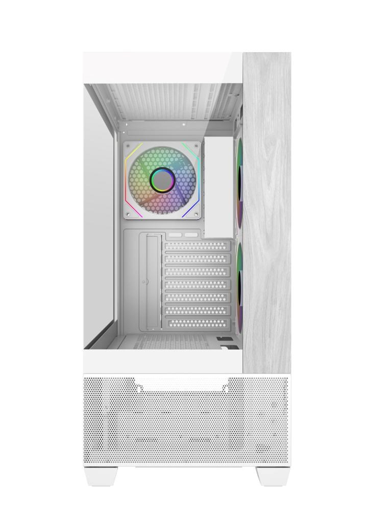 Model Elite 690 má čistý a moderní design a je vybaven dvěma panely z tvrzeného skla na přední a boční straně, které prezentují prémiové komponenty a osvětlení RGB. Přední panel kombinuje přírodní akcent s texturou dřeva se spodním sáním ze síťoviny, což přináší jak estetické teplo, tak efektivní proudění vzduchu. Díky rozsáhlému větrání na horní a spodní straně podporuje skříň univerzální konfigurace ventilátorů a chladičů, které umožňují výkonné vertikální chlazení. Ať už stavíte vysoce výkonnou předváděcí sestavu nebo stylovou stolní sestavu, Elite 690 poskytuje dokonalou rovnováhu mezi funkčností a formou.