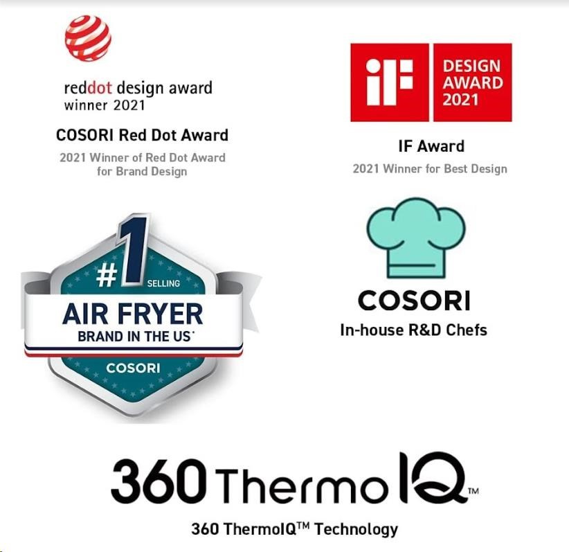 Design horkovzdušné fritézy COSORI CAF-P583S byl navržen v Kalifornii. Díky své praktičnosti, funkcím, ovládání i přehlednému nakloněnému dotykovému LED displeji se snadno přístupnými tlačítky získal také prestižní ocenění Red Dot Award za nejlepší design.