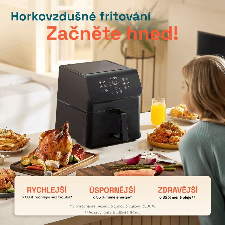 Představujeme horkovzdušnou fritézu Cosori Premium II. Inovované řešení, které nejen šetří čas, ale také energii a nabízí způsob vaření, který je šetrný ke zdraví. S horkovzdušnou fritézou si můžete užívat oblíbená jídla připravovaná s minimem oleje, vyhnete se zápachu ze smažení a také úklid je díky možnosti mýt koš v myčce hračkou. Fritéza nabídne koš se štědrým objemem 6,2 litrů, takže v ní je možné pohodlně připravit jídlo pro 3-5 lidí, například celé, 2,3 kg kuře. Při vysoké objemu si ale zachová malé vnější rozměry, takže se hodí i do malých kuchyní. S technologií 360° cirkulujícího vzduchu se fritéza zahřeje na provozní teplotu do 5 minut a dále výrazně zkracuje dobu vaření. Malý objem také znamená malou spotřebu energie ve srovnání s běžnou troubou. Fritéza nabídne 12 programů pro přípravu pokrmů, které je možné upravit podle individuálních chutí. Displej fritézy je přehledný a pohodlně nakloněný pro perfektní čitelnost. V dnešní digitální době je také poměrně atraktivní funkce vypnutí zvuku tlačítek. Jako bonus si můžete stáhnout e-kuchařku s 80 recepty v češtině i slovenštině.