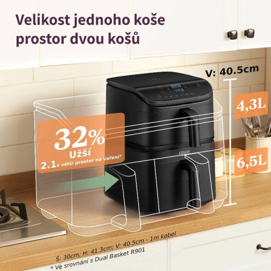 Turbo Tower nabízí řešení problému s místem. Fritéza zabírá minimální prostor, ale nabízí celkový objem téměř 11 litrů. Můžete tak najednou připravit oběd pro celou rodinu, hromadu hranolek pro filmový maraton nebo speciality na party. Malý prostor nevadí, Cosori to vyřeší s rozměry 40,5 x 30 x 41,3 cm (V x Š x H).