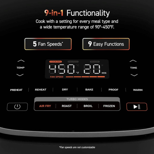 - 9 funkcí: fritování, pečení masa, sladké pečení, grilování, sušení ovoce nebo zeleniny, příprava mražených potravin, ohřívání, kynutí, předehřev a udržování teploty5 rychlostí ventilátoru zaručuje dokonalé jídlo bez nutnosti míchaní při vaření