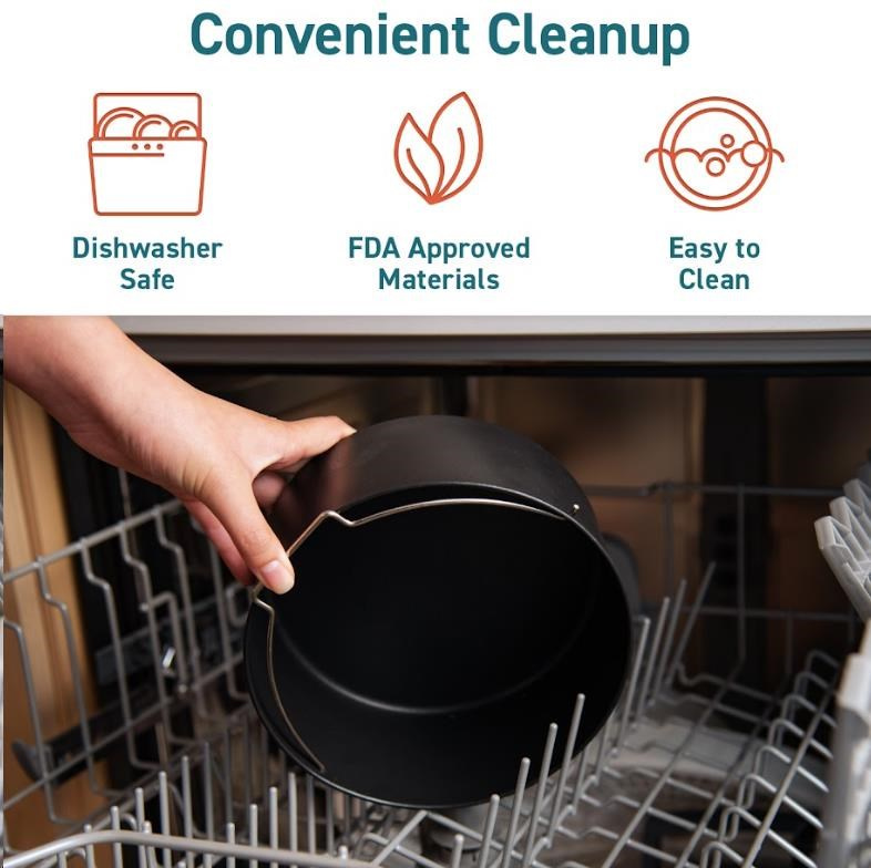 Veškeré příslušenství lze mýt v myčce na nádobí. Obsahuje materiály bez BPA (Bisphenol-A), vysoce kvalitní nerezovou ocel, teflon (neviskózní, odolný proti opotřebení) a žáruvzdorný silikon s certifikací FDA.