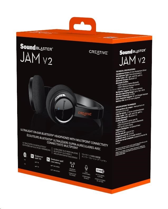 Vaše oblíbená přenosná Bluetooth® sluchátka na uši jsou zpět – se stejným designem lehkým jako pírko a vysoce kvalitními neodymovými měniči! Produkt Sound Blaster JAM V2 je nyní vybaven technologií Bluetooth 5.0. Společně s rozšířenými zvukovými kodeky aptX™ HD a aptX™ Low Latency poskytuje nejlepší bezdrátový poslech. Užijte si bohatý a dechberoucí zvuk. Funkce Multipoint umožňuje zřetelně přepínat mezi dvěma různými zdrojovými zařízeními Bluetooth, aniž byste vyšli z rytmu.