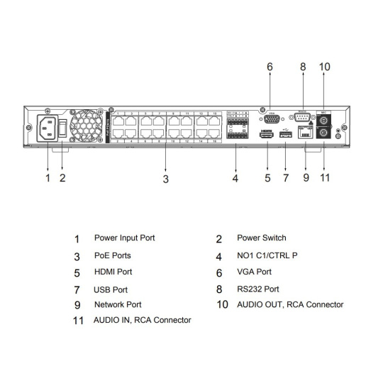 1× 10/100/1000 MbE RJ-45, 16× 10/100 Mbps RJ-45 PoE (IEEE 802.3 af/at), 1× audio vstup (RCA), 1× audio výstup (RCA), 4× alarm vstup, 2× alarm výstup, 2× USB 2.0, pozice pro 2× SATA HDD (max. 20 TB/disk), 1× HDMI, 1× VGA, 1× RS-232.