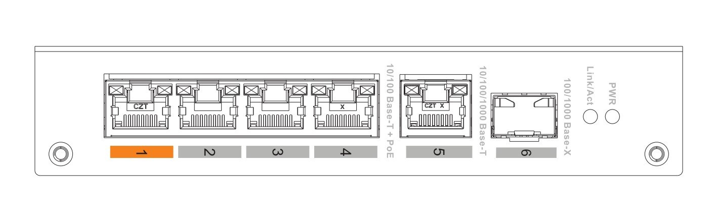 - Port pro přenos dat: Port 1–4: 4 × RJ-45 10/100 Mbps (PoE); Port 5: 1 × RJ-45 10/100/1000 Mbps (Uplink); Port 6: 1 × SFP 100/1000 Mbps (Uplink)