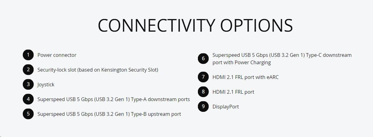 • 2 x HDMI 2.1 (HDCP 1.4 & 2.3)(Supports up to 3840 x 2160 240 Hz FRL, HDR, VRR as per specified in HDMI 2.1) (including 1x HDMI 2.1 FRL with eARC - to support Dolby ATMOS signal pass-through)