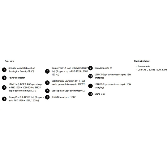 • 1 USB-C 5Gbps upstream port/s (DisplayPort 1.4 Alt Mode, Power Delivery up to 100 W)