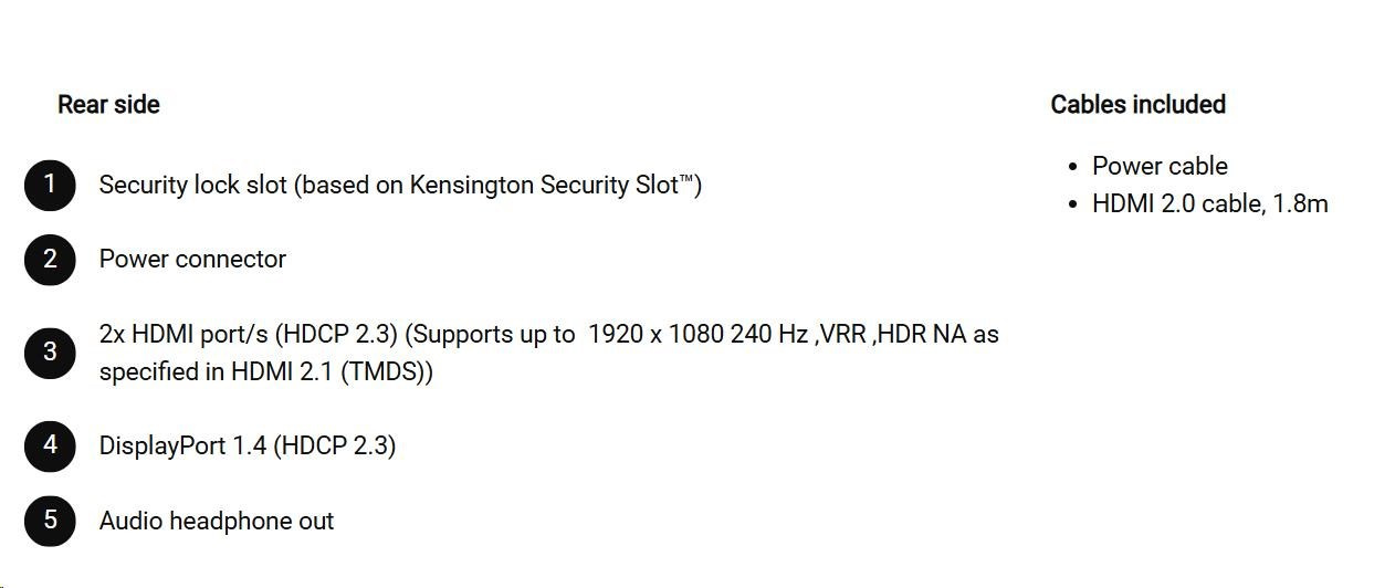 • 2 HDMI port/s (HDCP 2.3) (Supports up to 1920 x 1080, 240 Hz, HDR, VRR, as specified in HDMI 2.1 (TMDS))