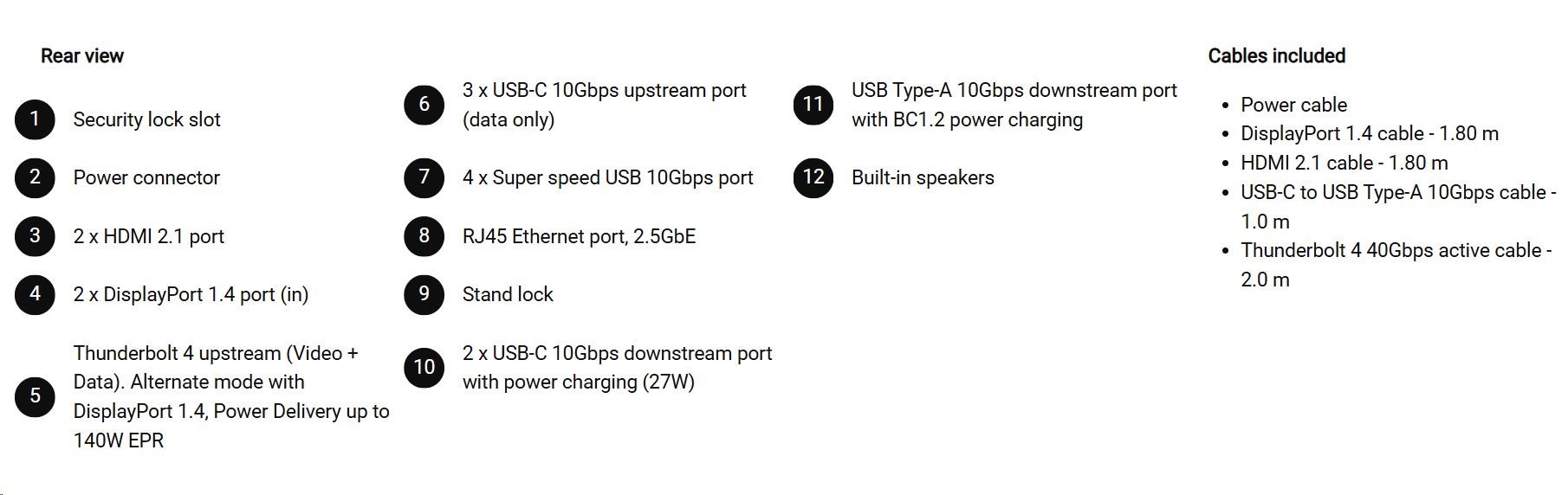 • 1 Thunderbolt 4 40Gbps upstream port/s (DisplayPort 1.4 Alt Mode, Power Delivery up to 140 W EPR)