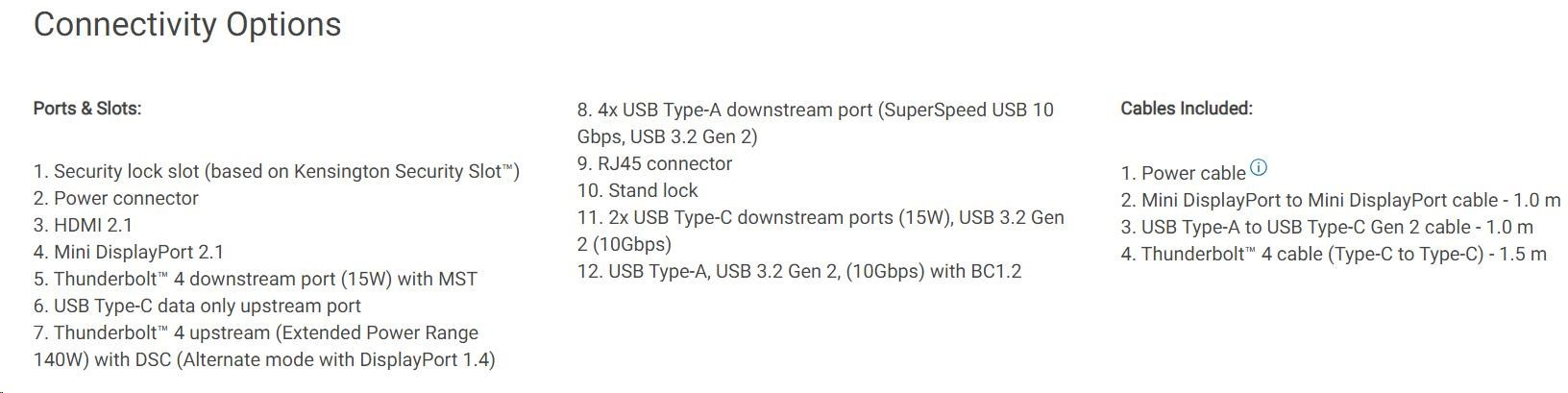 Použití:Profesionální; Rozlišení displeje:nespecifikováno; Úhlopříčka displeje ("):32; Výbava:VESA montáž, Pivot, Nastavitelná výška, Webkamera; HDMI počet:1; HDMI verze:2.0; DP počet:1; DP verze:2.0; USB počet:5; Thunderbolt počet:2; Thunderbolt verze:4; Doba odezvy (ms):8; Formát obrazovky:16:9; Typ panelu:IPS; Jas (cd/m2):450; Kontrast:1:2000.