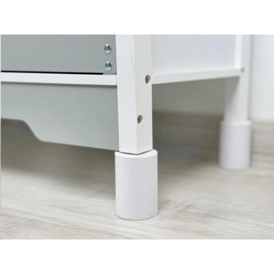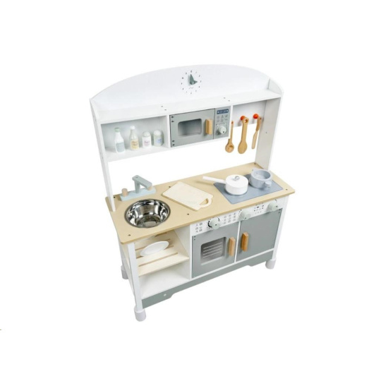 Dřevěná dětská kuchyňka v neutrální barevné kombinaci bílé a šedé barvy, doplněná bohatým příslušenstvím, je místem, kde vaše dítko může popustit uzdu své fantazii a kreativitě. Dětská kuchyňka se spotřebiči i nádobím je edukativní hračkou, která umožní dětem vyzkoušet si vaření, pečení a ostatní dospělácké činnosti bezpečným dětským způsobem. Díky přídavným nožkám (nástavcům) můžete kuchyňku zvednout o 6 cm.