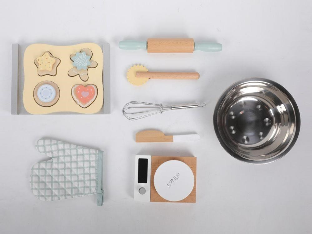 Dětská sada na pečení uložená v praktickém kufříku umožní dětem péct perníčky a sušenky kdekoliv se jim zachce - v kuchyni, v dětském pokoji, dětské kuchyňce, v zahradním domečku a klidně i na návštěvě u kamaráda nebo babičky, bezpečným dětským způsobem. Obsahuje vše potřebné pro upečení lahodné svačinky, kuchyňskou váhu, nádobí, náčiní, těsto i rukavici. Kufřík umožní dětem celou sadu rychle uklidit i přenášet..