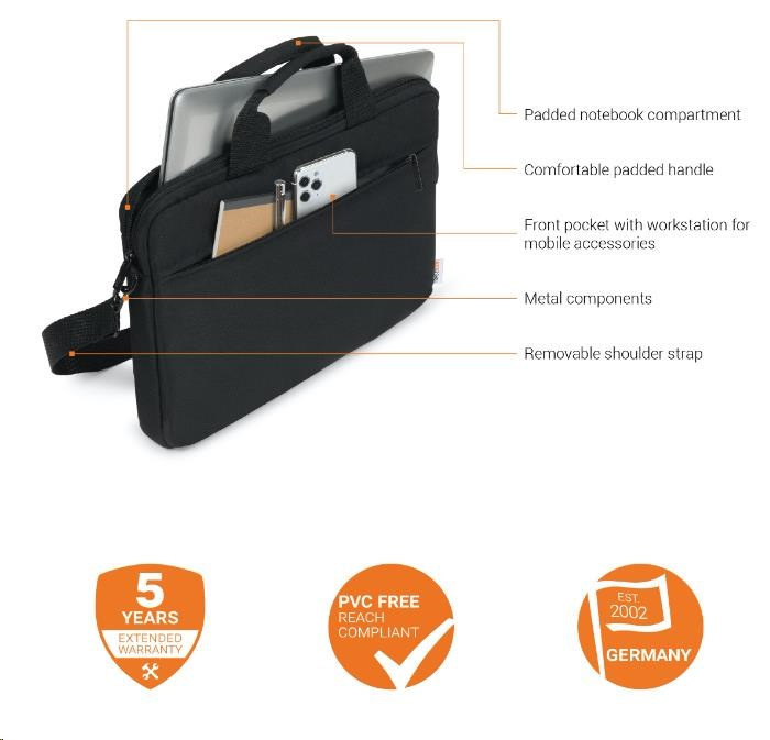 Product Description Your notebook will arrive at its destination safely with the BASE XX slim case. The main compartment is furnished with particularly thick padding, which means your device is completely protected from bumps and shocks. Documents and mobile accessories such as your smartphone, business cards, pens and so on are always within easy reach in the zip pocket on the front. The length-adjustable and removable shoulder strap and handle make the bag very easy to carry. BASE XX emphasises the durability of the product with an extended five year guarantee. Padded notebook compartment Front pocket with workstation for mobile accessories All around padding for extra protection High quality metal components Comfortable carrying handle and removable shoulder strap Picture may differ slightly from the original Additional Information Product Dimensions 360 x 260 x 35 mm EAN 7640186417259 Material 300Dx300D Polyester Colour camel brown.