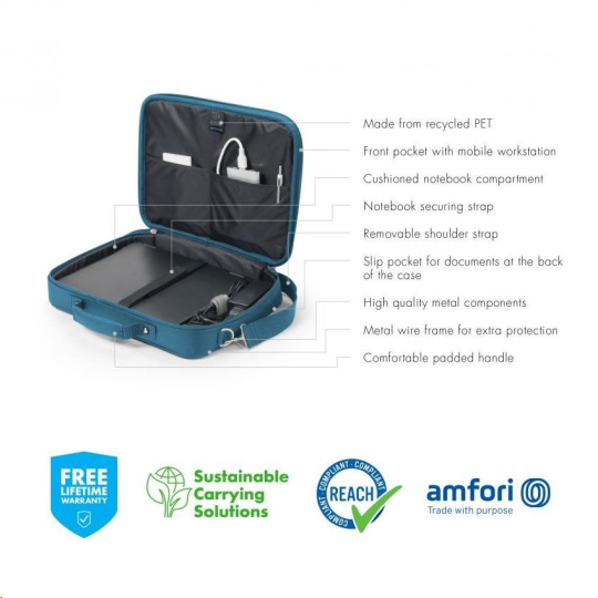 The compact Eco Multi BASE case offers ideal protection for your laptop thanks to its padded notebook compartment. The case fully protects devices between 14 and 15.6" and the elastic strap also secures them within their compartment. The Eco Multi BASE guarantees extra stability and protection with its metal frame, as well as flexible mobility thanks to its lightweight design. Your smartphone or other smaller items like cables, pens or chargers can be stored in the convenient front pocket, so they are always to hand. The case's handles make it comfortable to carry and it can be attached to a suitcase in seconds with its built-in strap. It can also be carried using its adjustable shoulder strap. The Eco Multi BASE is therefore perfect for you if you always on the go and want to support the recycling of PET bottles with an eco-friendly case.