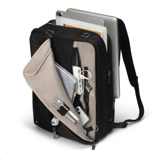 Flexibilita se setkává s bezpečností v tašce Top Traveller DUAL FIVE, konvertibilní pracovní tašce, která se plynule promění z elegantní aktovky v praktický batoh. Je vybavena ochranou DCT Notebook Protection a uzamykatelnou přihrádkou, takže váš notebook zůstane v bezpečí, zatímco skryté popruhy batohu umožňují snadné přepínání mezi různými způsoby nošení. Hlavní přihrádka nabízí prostor pro tablety, dokumenty a mobilní vybavení, zatímco přední část obsahuje strukturované kapsy na příslušenství a samostatnou malou kapsu na kabely a nezbytnosti. Navíc s 35,5% recyklovanými PET lahvemi použitými při výrobě je to chytrá a ekologická volba.