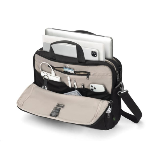 Brašna Top Traveller FIVE je navržena tak, aby chránila vaše zařízení a zároveň vám umožňovala snadný přístup k nezbytnostem. Uzamykatelná přihrádka na notebook s ochranou DCT Notebook Protection a polstrováním rohů z HDF pěny a EVA zajišťuje maximální bezpečnost, zatímco integrovaná kapsa poskytuje bezpečné uložení tabletů do velikosti 12,9". Hlavní přihrádka nabízí dostatek prostoru pro dokumenty, složky nebo mobilní vybavení a přední část obsahuje uspořádané kapsy na příslušenství. Malá přední kapsa poskytuje další úložný prostor pro kabely a menší předměty. Vyrobeno z 23,5" recyklovaných PET lahví.