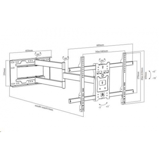 Dlouhý otočný držák na televize Ergosolid ONYX-20 Výborný držák s délkou 80-915mm a možností otočit Tv 70" kolmo ke zdi na obě strany Kvalitní nástěnný držák pro zavěšení televizorů s úhlopříčkou 43" až 75", televizory s úhlopříčkou do 70" lze na držáku otáčet kolmo ke zdi na obě strany. Konstrukce držáku je ocelová a zajiští bezpečné a spolehlivé zavěšení televizorů, které mají hmotnost až 45kg. Televizi lze nejen otáčet do stran, ale i naklápět nahoru nebo dolů a měnit vzdálenost od zdi. V případě nepřesné instalace nebo nerovností držák umožňuje korekci až +/- 5°. Podporuje VESA standardy 200x100 až 600x400. Barevné provedení černé, záruka 3 roky. Extra dlouhý držák na Tv pro otáčení Tv až 70" kolmo ke zdi - ergosolid onyx20 Technické údaje: nosnost 45kg VESA standardy 200x100 až 600x400 na televize 43" až 75" otáčení Tv do stran +/- 90° Tv s úhlopříčkou do 70" lze otočit i kolmo ke zdi na obě strany vzdálenost Tv od zdi 80-915mm náklon +5° / -10° korekce roviny +/- 5° kvalitní ocelová konstrukce bezpečný a spolehlivý držák balení obsahuje sadu instalačního materiálu barva černá záruka 3 roky.