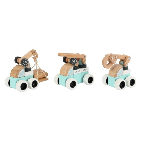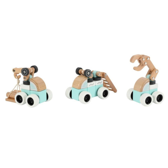 Sada dřevěných aut (strojů) nabízí spoustu možností ke hře. Každé auto je sestavené z kostek v barvě bílé, mátové nebo barvě přírodního dřeva a každé z aut obsahuje pohyblivou část (pohyblivé rameno nebo žebřík) pro ještě více zábavy. Auta jsou vyrobená tak, aby dobře padla do dětské ruky, pohodlně se držela a snadno se s nimi manipulovalo. Gumová kola tlumí hluk a šetří podlahu..