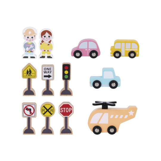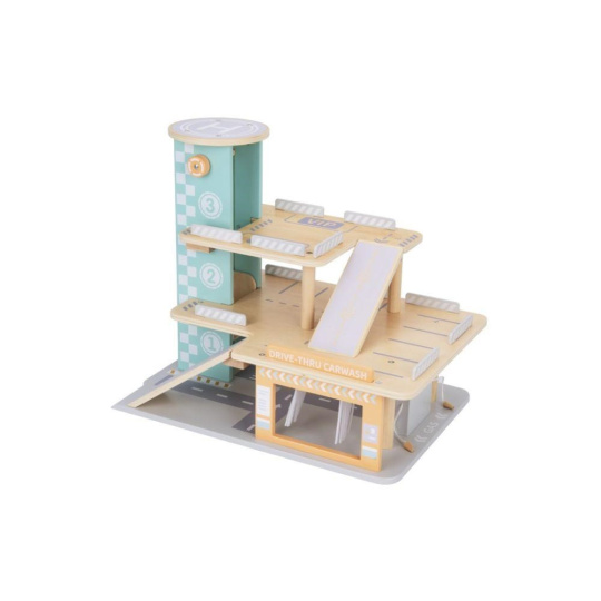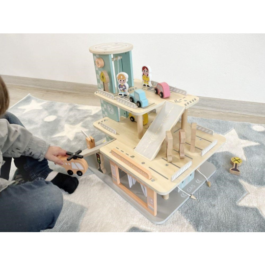 Garáž na autíčka s myčkou, v krásných jemných barvách, přinese dětem spoustu zábavy. Součástí 3 patrové dřevěné garáže je parádní myčka aut, tankovací stojan, výtah, heliport i spousta parkovacích míst pro autíčka. Bohaté příslušenství v podobě helikoptéry, autíček, dopravních značek a obsluhy garáže umožní, aby si s garáží pro autíčka vyhrálo vaše dítko samo nebo se svými kamarády..