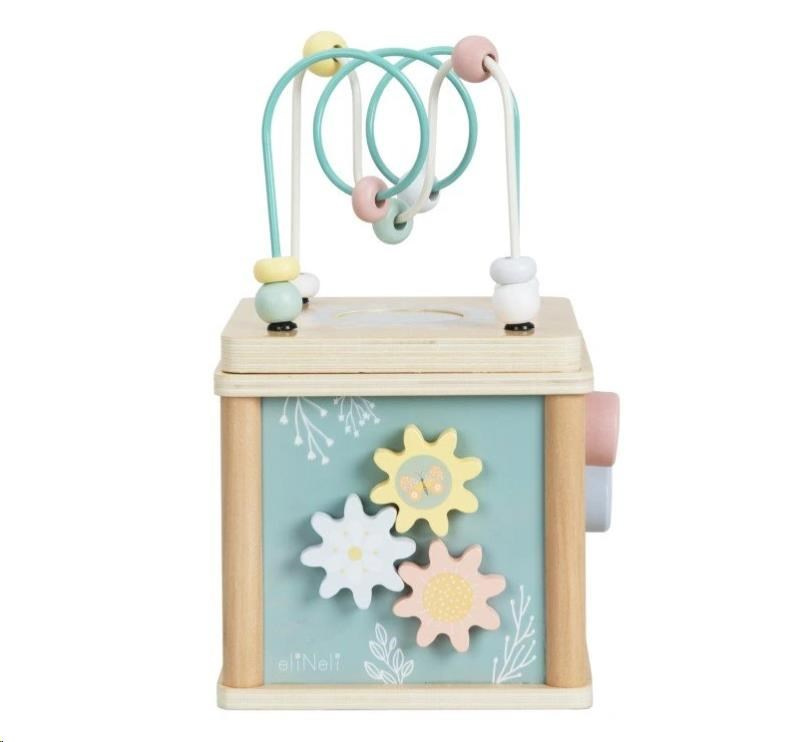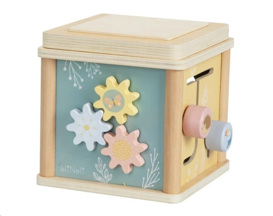 Dřevěná activity cube (kostka) se zvířátky si pro děti připravila spoustu aktivit, které potrénují a zdokonalí dětské dovednosti. Aktivity kostka vyrobená z masivního dřeva, překližky a MDF nabízí spoustu možností ke hře. Samotné víko (vrchní stranu) dřevěné kostky představuje zábavné bludiště v pastelových barvách, které dětem se svými zakroucenými drátky a dřevěnými korálky trochu zamotá hlavu. Jedna ze stran je vkládačkou, druhá bludištěm, třetí rozkvetlou loukou s květinami v podobě ozubených koleček a čtvrtá zábavnou hrou s otočnými destičkami.