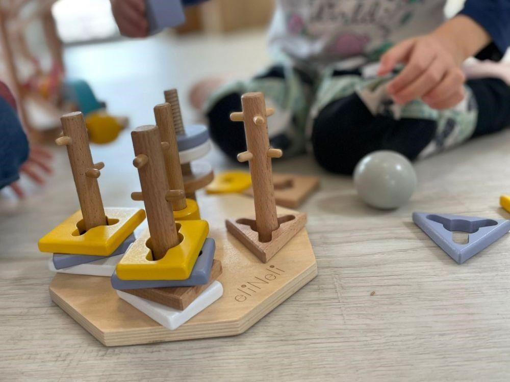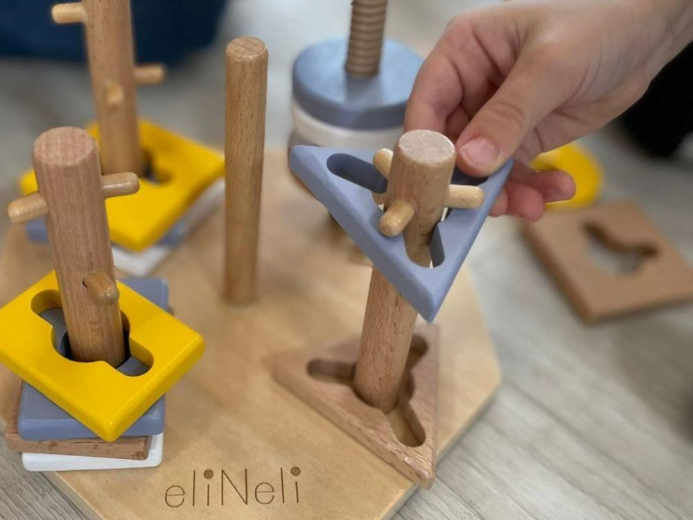 Úžasná motorická hračka, dřevěná navlékací hra s geometrickými tvary, přirozeným způsobem rozvíjí u děti motorické dovednosti, koordinaci očí a rukou, představivost, učí dětí soustředit se. Navlékací tvary v krásných neutrálních barvách děti nasazují na dřevěné kolíky, které však nejsou zcela hladké a dětem navlékání ztěžují různými výstupky. Někdy tato hra vyžaduje spoustu trpělivosti..
