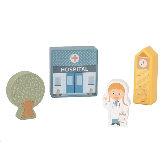 - Obsah balení: 20 dřevěných kostek (domečky, postavičky, stromy a dopravní značky).