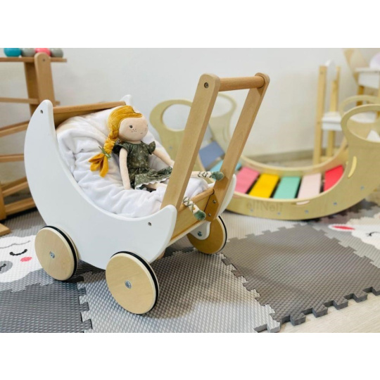 Designový kočárek ve tvaru měsíčku, vyrobený z přírodního dřeva, je jako stvořený pro krátké i dlouhé procházky, uspávání oblíbených panenek nebo plyšáků. Dřevěný kočárek dobře padne do dětské ručky, snadno se řídí a ovládá. Kočárek pro panenky zaparkovaný v dětském království vaší princezny je současně i krásnou dekorací..