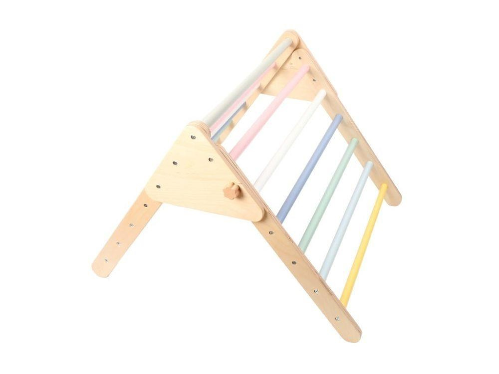 S pastelovým setem Piklerové trojúhelníku s montessori oboustranným prknem (skluzavka, lezecká stěna, stezka bosou nohou, balanční prkno) snadno vytvoříte dětské hřiště přímo u vás doma. Piklerové trojúhelník set v kombinaci přírodního dřeva a pastelových barev motivuje děti k prozkoumání, objevování svých možností, odvahy a k pohybu. Děti při šplhání, přelézání, lezení a klouzání procvičí celé tělo a ještě si užijí spoustu zábavy. Prolézačka je vybavena systémem proti protáčení tyčí, bezpečnostním šroubem a samozřejmostí jsou obroušený povrch a hrany..