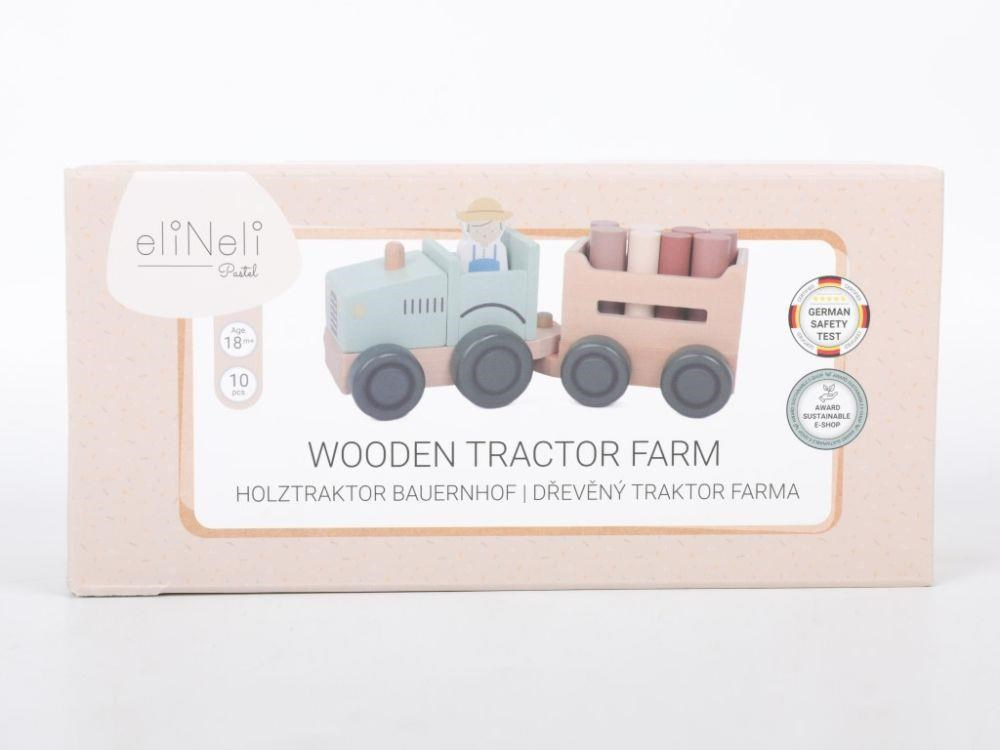 Parádní dřevěný traktor v jemné zelenkavé barvě, s traktoristou, vlečkou a nákladem v podobě klád (dřevěný válečků), promění děti ve skutečné farmáře. S tímto dřevěným traktorem se děti vydají do lesa na dříví, mohou převážet zvířátka z farmy a jakékoliv jiné hračky, kostky, co se jim podaří na vlečku naložit. Při hře s traktůrkem děti hrají role, zdokonalují motorické dovednosti a koordinaci očí a rukou..