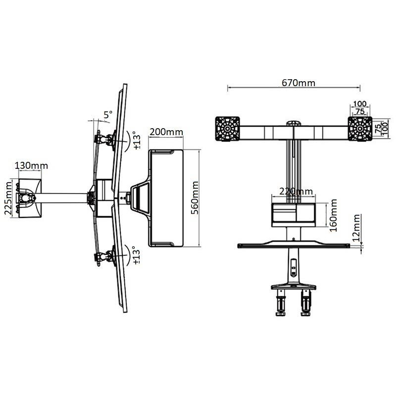 Stolní držák na 2 monitory a klávesnici NB FC24-2A-B Profesionální pracovní stanice pro dva monitory 17-27" s policí na klávesnici a myš, ergonomický držák pro rychlou změnu pro práci vsedě nebo vestoje, plná polohovatelnost, VESA 75x75 a 100x100, plynová pružina, nosnost 15kg Profesionální stolní držák na 2 monitory 17-27" s policí na klávesnici a myš, ergonomický pro práci ve stoje nebo vsedě se snadným a rychlým výškovým polohováním 480mm. Monitory lze na držáku posouvat do stran, naklápět, otočit na šířku nebo na výšku, mírně natáčet do stran, výškově polohovat. Extrémně snadné výškové polohování celého držáku díky plynové pružině, během okamžiku můžete změnit pozici vsedě na pozici vestoje a otočit držák do stran +/- 180°. Profesionální kvalita s důrazem na dizajn, 2x USB porty 3.0, systém pro vedení kabeláže, snadná instalace na stolové desky o průměru 10-95mm. Barevné provedení černé, záruka 3 roky. Pracovní stanice na 2 monitory 17-27" s policí na klávesnici a myš, ergonomický pro práci vsedě nebo vestoje NB FC24-2A Technické údaje: nosnost minimální 9kg / maximální 15 kg VESA standard 75x75 a 100x100 na monitory a displeje s úhlopříčkou 17-27" naklápění monitorů +16° / -10° nastavení výšky monitoruod police +/- 191 mm výškové polohování celého držáku +/- 480 mm maximální výška od pracovní desky 1011 mm otáčení do stran +/- 180° funkce PIVOT - otočení monitorů na šířku nebo na výšku úprava vzdálenosti police 0 ~ 60 mm rozměry police na klávesnici 560x200 mm organizátor pod obrazovkou o rozměrech 220x160 mm dva porty USB 3.0 systém vedení kabeláže ergonomický držák pro rychlé nastavení pro práci vsedě nebo vestoje uchycení na okraj stolu, stolové desky o síle 10-95mm profesionální kvalita a zpracovnání jednoduchá montáž a velmi snadné polohování barevné provedení černé záruka 3 roky Držák NB FC24-2A-B podporuje VESA standardy: VESA 75x75 VESA 100x100.