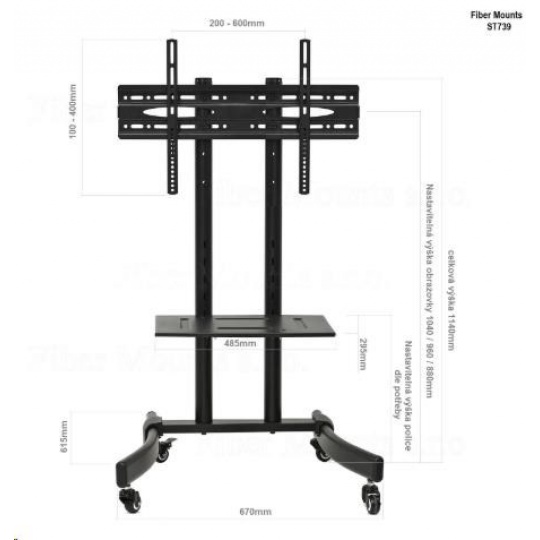 Technické údaje: maximální zatížení vozíku 40kg maximální zatížení police 5kg podpora VESA standardu 200x100 až 600x400 doporučená úhlopříčka televizoru 32" až 65" celková výška stojanu 1140mm stavitelná výška obrazovky ve 3 pozicích 104 / 96 / 88cm (výška po střed televizoru) police na příslušenství o rozměrech 485x295mm stavitelná výška police - možnost demontáže pevný, stabilní podstavec o rozměrech 670x615mm barevné provedení černé ekonomické balení o rozměrech 1060x350x120mm a hmotnosti 15kg záruka 2 roky Vozík na televizi Fiber Mounts ST739 podporuje VESA standardy: VESA 200x100 VESA 200x200 VESA 300x200 VESA 300x300 VESA 400x200 VESA 400x300 VESA 400x400 VESA 600x400.