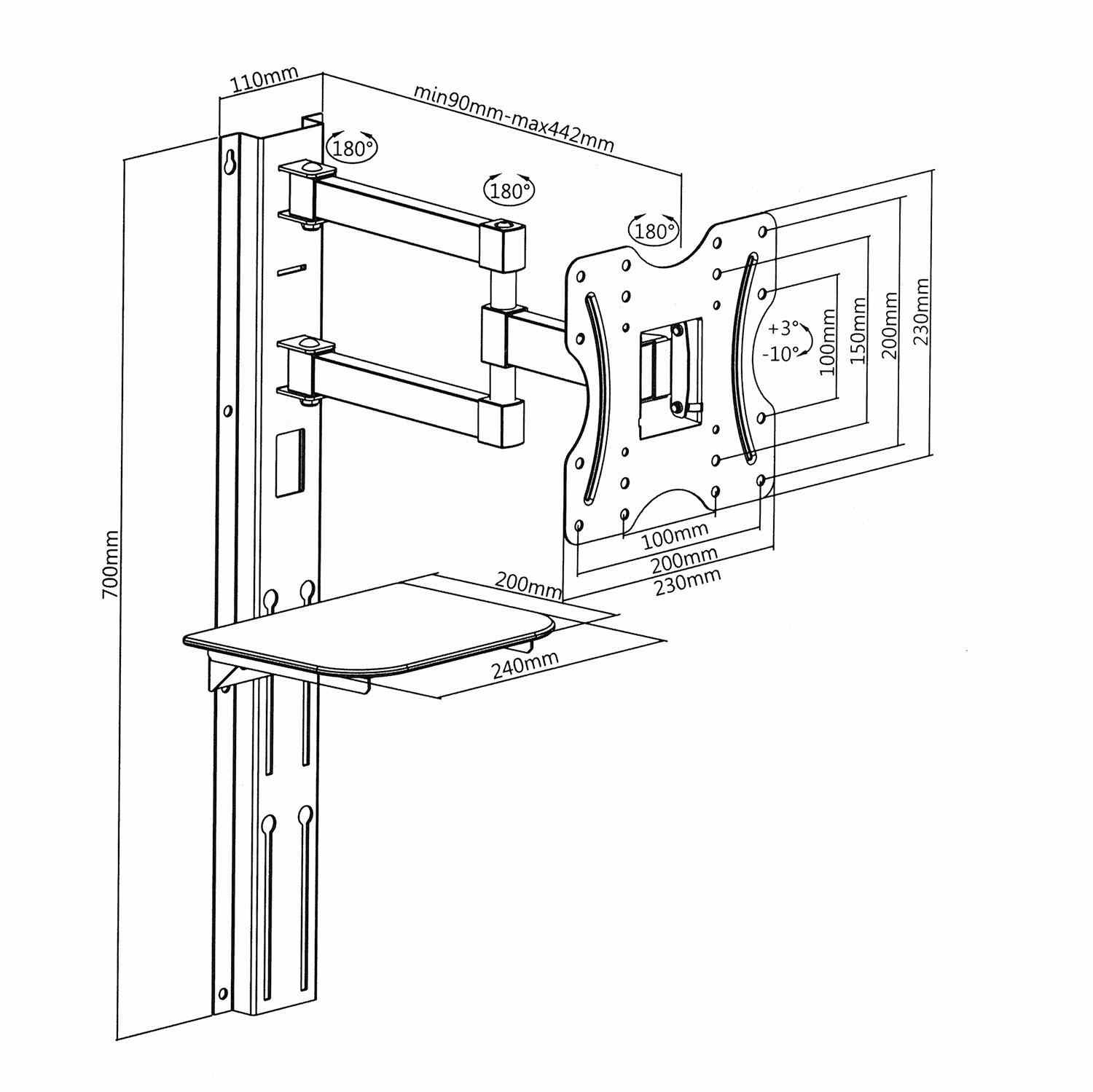 Fiber Mounts SET771 levná sestava držáku Tv a poličky Držák na Tv 23-50" a polička na příslušenství 240x200mm, otáčení Tv až +/- 90°, naklápění +3° / -10°, vzdálenost od zdi 90-442mm, VESA 100*100 až 200*200, instalační materiál, nosnost poličky 6kg, nosnost držáku 30kg Sestava nástěnného držáku na televizi a poličky. Sestava obsahuje polohovatelný držák pro uchycení LCD LED televize 23-50 palců, který umožňuje otáčení televize do stran, její naklonění a nastavení potřebné vzdálenosti od zdi, skleněnou polici na jakékoliv příslušenství a závěsnou lištu. Police můžete výškově polohovat. Celková nosnost sestavy Fiber Mounts SET771 je 30kg. Polička je z tvrzeného skla o rozměrech 24x20cm a nosností 6kg. Veškerou kabeláž je možné ukrýt do závěsné lišty. Levná sestava polohovatelného držáku na Tv 23-42 palců, police na příslušenství a závěsné lišty se systémem vedení a uschování kabeláže - Fiber Mounts SET771 Technické údaje: maximální celkové zatížení 30kg nosnost police 6kg držák podporuje VESA standardy 100x100 až 200x200 univerzální, vhodný na všechny typy a značky televizorů doporučená úhlopříčka Tv 23-50 palců držák umožňuje otáčení Tv do stran +/- 90° držák umožňuje naklonění obrazovky + 3° až - 10° držák umožňuje nastavení vzdálenosti Tv od zdi v rozmezí 90 až 442mm polička z tvrzeného skla 6mm rozměry police 240x200mm výškové polohování police materiál ocel a tvrzené sklo délka závěsné lišty 700mm možnost uschovat veškerou kabeláž do závěsné lišty balení obsahuje sadu instalačního materiálu barevné provedení černé záruka 2 roky Držák podporuje VESA standardy: VESA 100x100 VESA 200x100 a 100x200 VESA 200x200 držák nepodporuje VESA 75x75 Na držák je možné zavěsit všechny typy a značky televizorů, jejichž hmotnost není vyšší jak 30kg a které podporují VESA standard 100x100, 200x100 nebo 200x200..