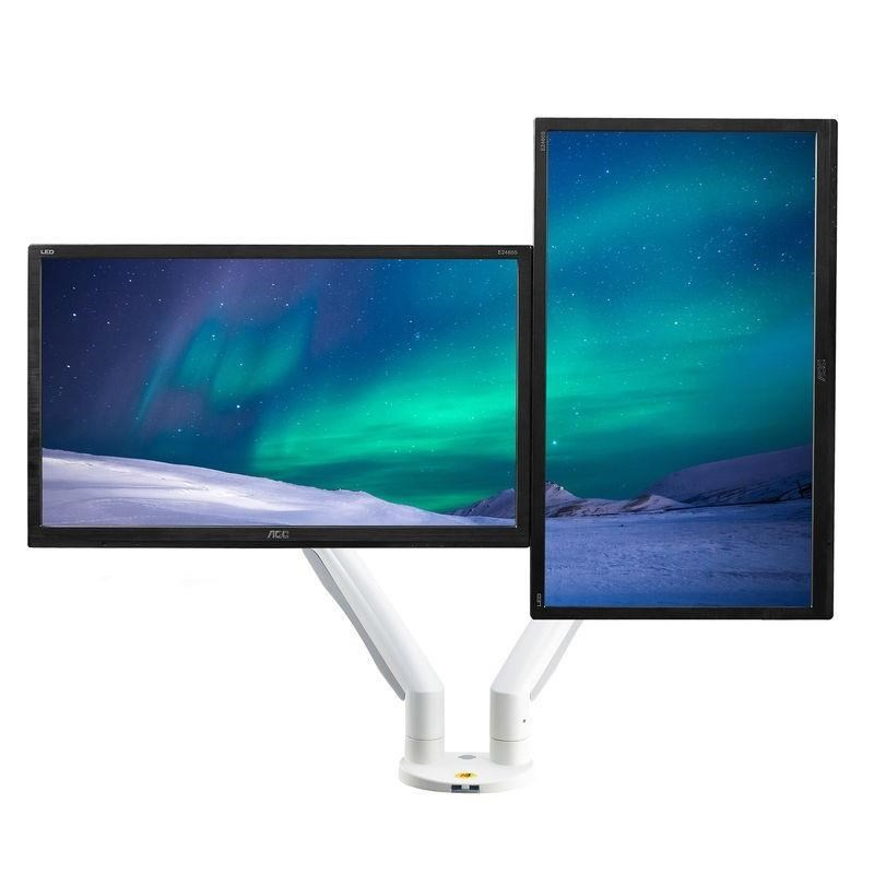 Dvoumonitorový stolní držák NB F195AW Profesionální stolní držák na 2 monitory 21-32", 3D nezávislé nastavení polohy, bílé provedení, profesionální kvalita Špičkový stolní držák pro zavěšení 2 monitorů a jejich nezávislé nastavení polohy: otáčení do stran, nastavení výšky, nastavení vzdálenosti od stolního úchytu, náklon, rotace obrazovky, korekce roviny. Různé nastavení polohy monitorů - vedle sebe na šířku, vedle sebe na výšku, pod sebou na šířku, nebo jeden monitor na šířku a druhý na výšku. Hmotnost každého monitoru musí být v rozmezí 3-9kg. Balení obsahuje 2 typy úchytů na stolovou desku, instalační materiál a návod. Barevné provedení bílé. Záruka 3 roky. Bílý držák na dva monitory, polohovatelný, profesionální kvality, záruka 3 roky - Mounts F195AWProfesionální bílý držák na 2 monitory, různé polohování monitorů, plně nastavitelný držák, TOP kvalita - Mounts F195AW Bílý držák na dva monitory, do kanceláře, pracovny, nemocnice, ordinace. Top kvalita, snadné polohování. Držák 2 monitorů Mounts F195AW Technické údaje: celková nosnost 18kg hmotnost každého monitoru musí být v rozmezí 3 ÷ 9 kg podpora VESA standardu 75x75 a 100x100 v případě potřeby za příplatek možnost rozšíření VESA na 200x100 nebo 200x200 doporučená úhlopříčka monitorů 21" až 32" nezávislé nastavení výšky: min. 220mm, max. 565mm nezávislé otáčení monitoru do stran +/- 180° nezávislé naklonění monitoru +53° až -8° nezávislá rotace monitoru - otočení monitoru na šířku nebo na výšku, korekce roviny nezávislé nastavení vzdálenosti od stolního úchytu: 0mm až 700mm uchycení na stolové desky o průměru 10mm až 90mm balení obsahuje 2 typy úchytů na stolové desky (na okraj, do prostoru) 2x USB port vynikající kvalita, krásný design snadné nastavení polohy monitorů spolehlivost, bezpečnost barevné provedení bílé, stříbrné nebo černé záruka 3 roky Mounts F195AW - bílý stolní držák pro nezávislé zavěšení a polohování dvou monitorů Dvoumonitorový stolní držák NB F195AW podporuje VESA standardy: VESA 75x75 VESA 100x100 za příplatek rozšíření na VESA 200x100 za příplatek rozšíření na VESA 200x200 Bílý držák na dva monitory Mounts F195AW Velmi pěkný bílý držák na dva monitory, nezávislé polohování každého monitoru, snadná nastavitelnost, profesionální kvalita a zpracování. Ideální držák do moderních kanceláří, ordinací, nemocnic nebo pracoven..