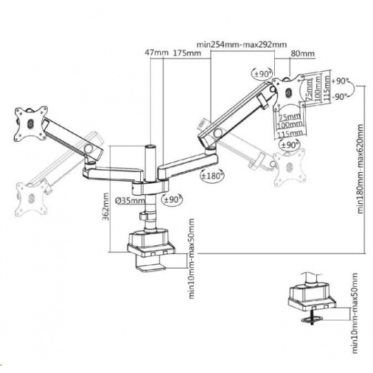 Dvouramenný stolní držák na 2 monitory Mounts AX812 Profesionální plně polohovatelný stolní držák na 2 monitory 17-32", nosnost 16kg Stolní držák do kanceláře nebo pracovny pro zavěšení dvou monitorů s úhlopříčkou 17-32". Držák má nezávislé nastavení polohy každého ramene, proto každý z monitorů můžete dát přesně tam, kde ho potřebujete. Vynikající kvalita a profesionální zpracování zaručuje, že Vám bude držák spolehlivě sloužit opravdu velmi dlouho dobu. Barevné provedení černé. Záruka 5 let. Technické údaje: nosnost 16kg (2 x 8kg) podpora VESA standardů 75x75 a 100x100 na monitory s úhlopříčkou 17" až 32" nezávislé polohování každého ramene držáku otáčení do stran +/- 90° nastavení náklonu +/- 75° rotace obrazovky - horizontální nebo vertikální otočení monitoru výškové polohování - nastavení výšky na každém rameni a celkové na nosné tyči minimální výška 180mm, maximální výška 620mm uchycení na stolové desky o průměru 10mm až 50mm 2 typy uchycení - na okraj stolu nebo do prostoru integrované porty USB 3.0 - 2x materiál hliník + ocel barevné provedení černé záruka 5 let Držák na dva monitory AX812 podporuje VESA standardy: VESA 75x75 VESA 100x100 rozšíření na 200x100 a 100x200 (není součástí balení, zakoupení za připlatek) rozšíření na 200x200 (není součástí balení, zakoupení za příplatek).