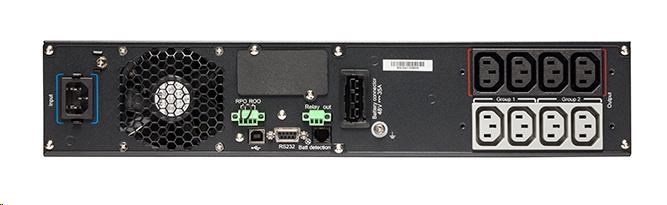 | Obsah balení | UPS (2) Výstupní IEC-IEC kabely USB kabel Sériový kabel (2) držáky pro montáž do 19' rozváděče (2) Sada pro montáž do skříně (2) Podpěry pro samostatně stojící montáž Systém pro uchycení kabelu Bezpečnostní pokyny Stručná příručka |
