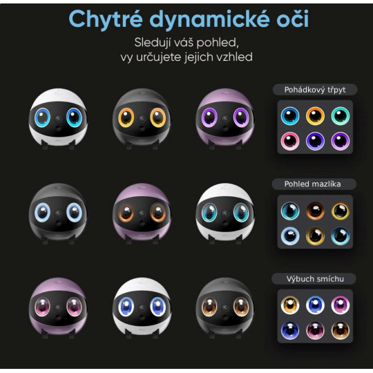 • Chytré dynamické oči – dva displeje s nastavitelnými barvami a animacemi dodávají robotovi osobnost a přátelský vzhled