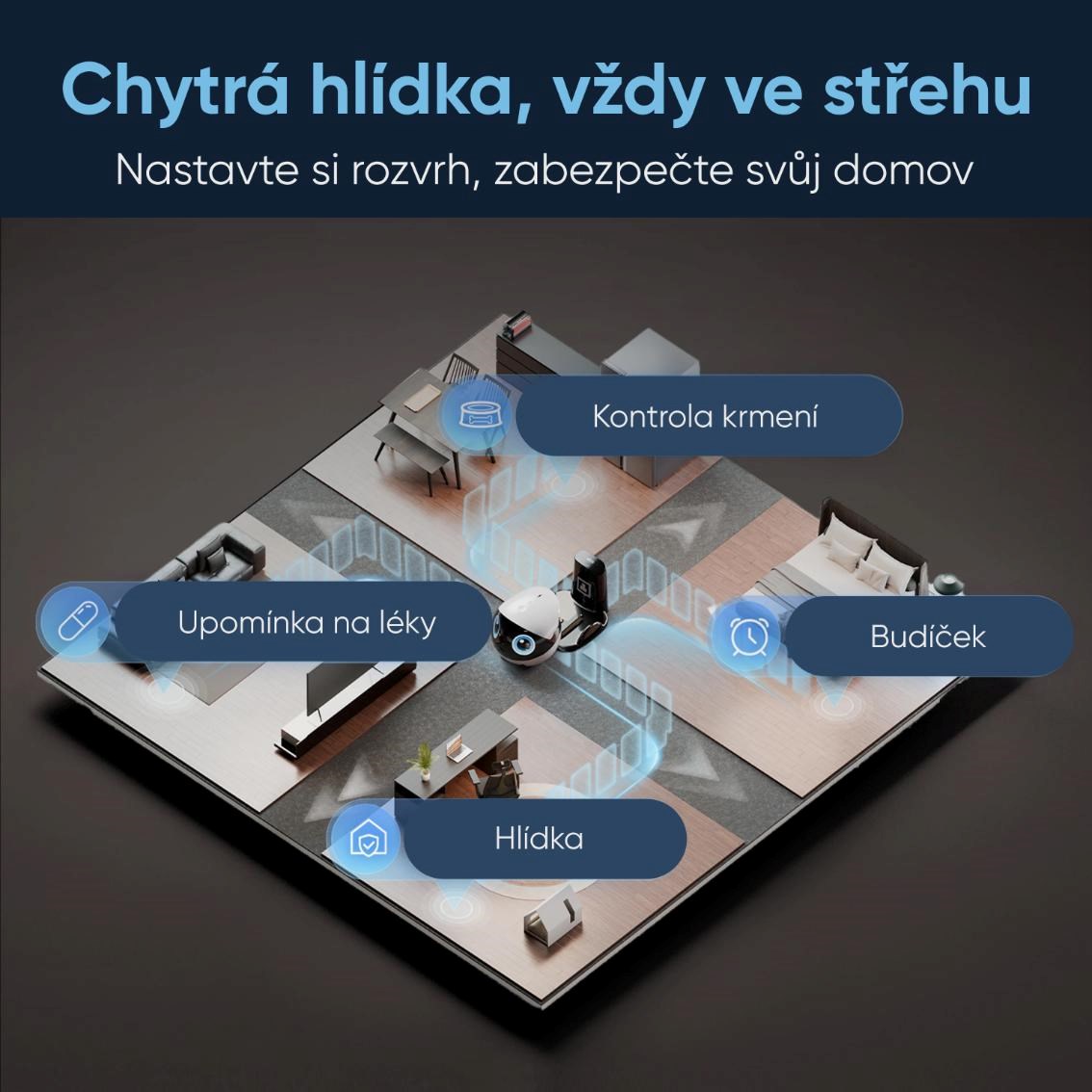 • Uživatelsky přívětivá mobilní aplikace – snadné ovládání, přístup k živému videu, ukládání záznamů a kompletní správa všech funkcí v jednom rozhraní. Jednoho robota může v aplikaci sdílet více uživatelů.