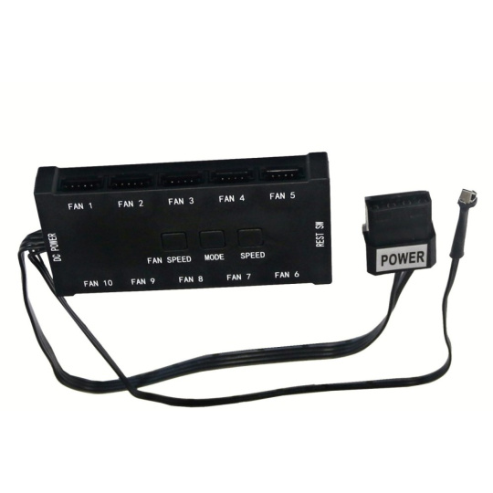- řídící jednotka umožňuje připojení až 10ks ventilátorů a ovládání tlačítky přímo na jednotce, napájení jednotky přes konektor "molex" z PC zdroje
