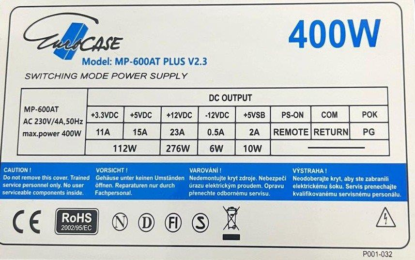 Napájecí zdroj ATX značky Eurocase s výkonem 400W. Je osazen 120mm ventilátorem a pasivním PFC (Power factor correction). Otáčky ventilátoru jsou řízeny termoregulací. Zdroj splňuje požadavky na elektrickou bezpečnost a elektromagnetickou kompatibilitu. Zdroj vyhovuje i směrnici 2005/32/EU = příkon v pohotovostním režimu.